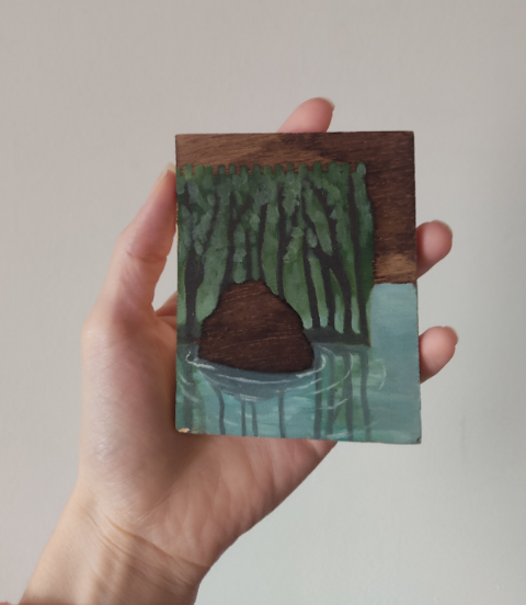 Plusieurs éléments m’ont amenée à travailler sur de petits formats. Tout d’abord, lorsque je découpe mes panneaux de bois, il me reste souvent de petites chutes que j’ai eu envie d’utiliser. Ensuite, dans le cadre de mon travail vidéo, j’ai pensé qu’il serait intéressant de créer des « zooms » sur certains éléments de mes peintures, comme pour mettre certains détails en avant, ou ponctuer mes installations de petites "virgules picturales".