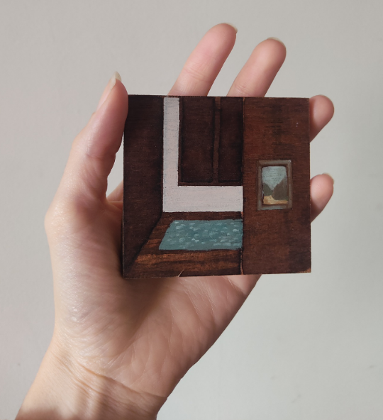 Plusieurs éléments m’ont amenée à travailler sur de petits formats. Tout d’abord, lorsque je découpe mes panneaux de bois, il me reste souvent de petites chutes que j’ai eu envie d’utiliser. Ensuite, dans le cadre de mon travail vidéo, j’ai pensé qu’il serait intéressant de créer des « zooms » sur certains éléments de mes peintures, comme pour mettre certains détails en avant, ou ponctuer mes installations de petites "virgules picturales".