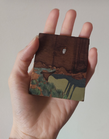 Plusieurs éléments m’ont amenée à travailler sur de petits formats. Tout d’abord, lorsque je découpe mes panneaux de bois, il me reste souvent de petites chutes que j’ai eu envie d’utiliser. Ensuite, dans le cadre de mon travail vidéo, j’ai pensé qu’il serait intéressant de créer des « zooms » sur certains éléments de mes peintures, comme pour mettre certains détails en avant, ou ponctuer mes installations de petites "virgules picturales".