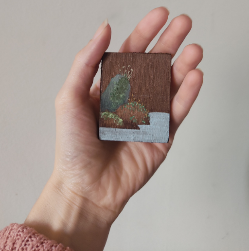 Plusieurs éléments m’ont amenée à travailler sur de petits formats. Tout d’abord, lorsque je découpe mes panneaux de bois, il me reste souvent de petites chutes que j’ai eu envie d’utiliser. Ensuite, dans le cadre de mon travail vidéo, j’ai pensé qu’il serait intéressant de créer des « zooms » sur certains éléments de mes peintures, comme pour mettre certains détails en avant, ou ponctuer mes installations de petites "virgules picturales".