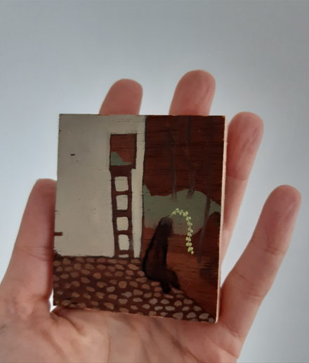 Plusieurs éléments m’ont amenée à travailler sur de petits formats. Tout d’abord, lorsque je découpe mes panneaux de bois, il me reste souvent de petites chutes que j’ai eu envie d’utiliser. Ensuite, dans le cadre de mon travail vidéo, j’ai pensé qu’il serait intéressant de créer des « zooms » sur certains éléments de mes peintures, comme pour mettre certains détails en avant, ou ponctuer mes installations de petites "virgules picturales".